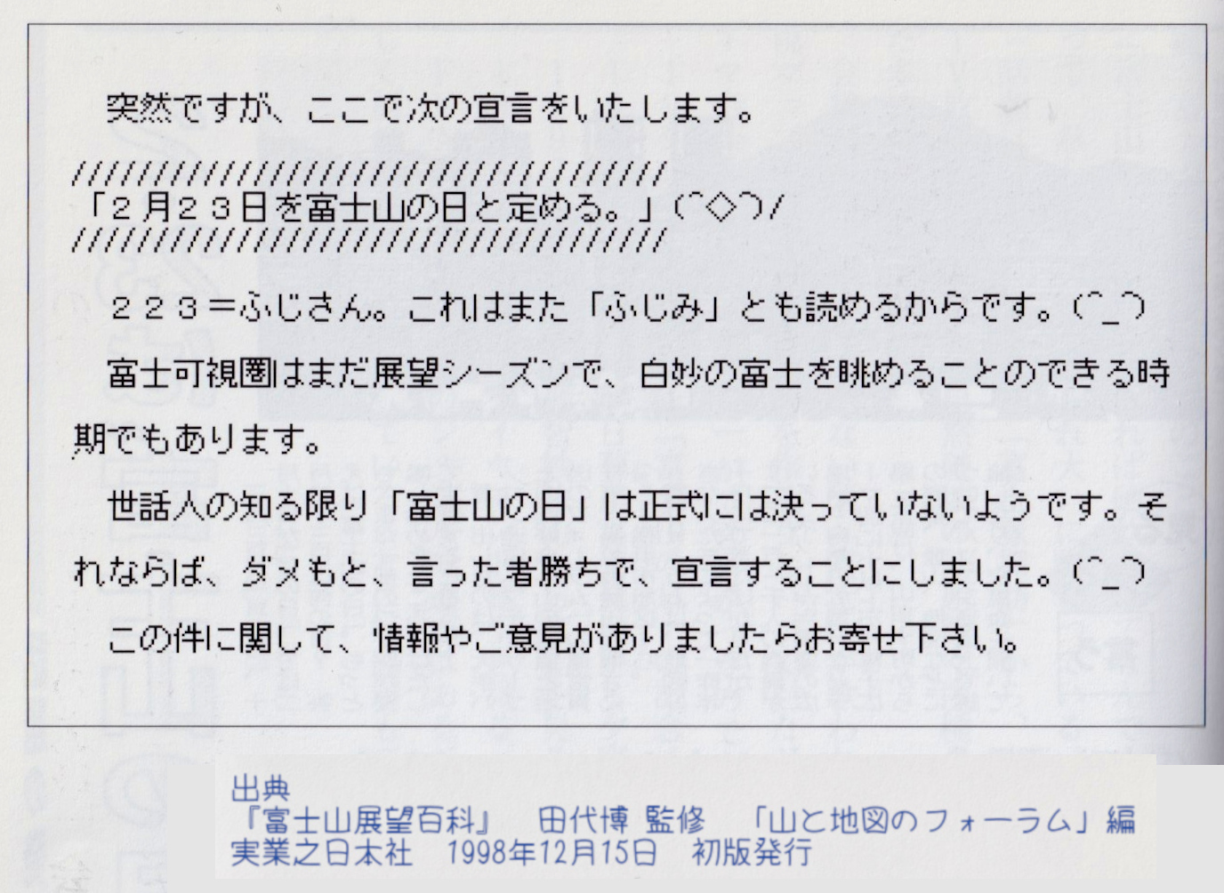 2月23日は富士山の日です。1996年1月1日に日本地図センター前相談役だった故田代博氏がパソコン通信ニフティサーブの「山の展望と地図のフォーラム」で宣言をしたのが始まりです。自治体等がその後に宣言していますが、元は30年前のこの宣言で、日本記念日協会にも登録されています。
